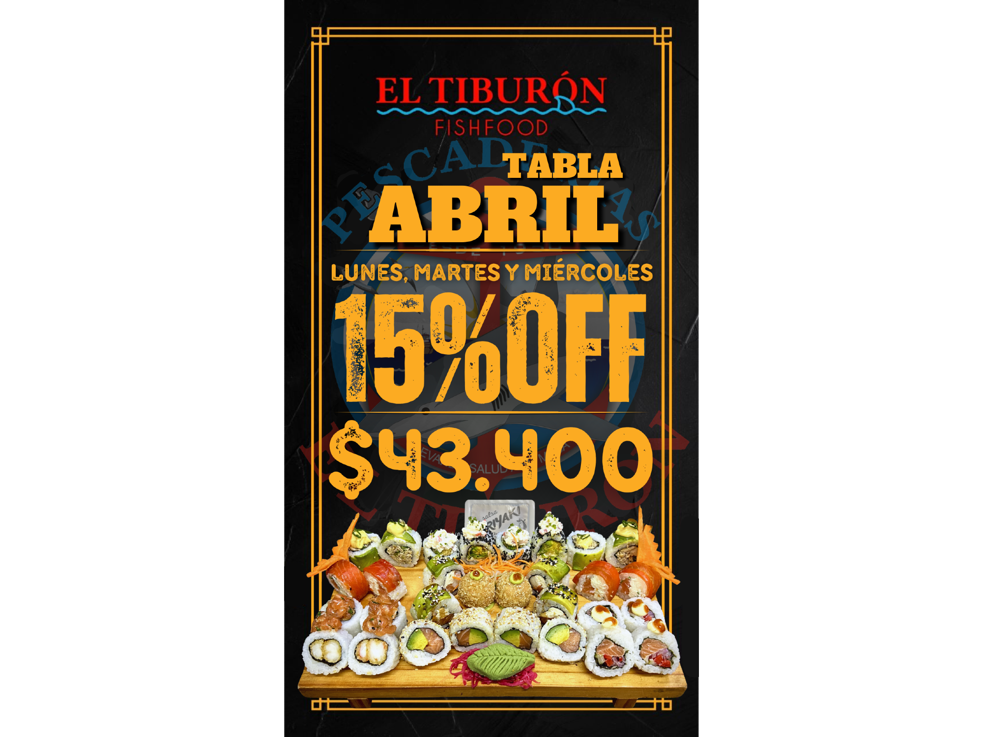 SUSHI MEDIODIA Compartir por WhatsApp Copiar enlace PROMO SUSHI LUNES, MARTES Y MIERCOLES Otros PROMO SUSHI LUNES, MARTES Y MIERCOLES (1) (901) PROMO TABLA ABRILx30 PIEZAS $43.400 Otros (2) COMBINADOS EXTRA x12p desde $19.890 (662) MIX ROLL x9 piezas (variado) $15.750